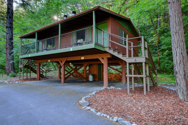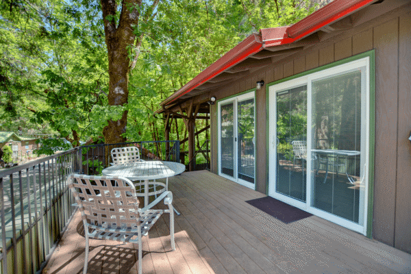 The studio cabin has a shared deck with river views and stair access. These rooms also include a private bathroom and a queen-size bed — or two twin beds. These quaint little cabins are just right for a romantic getaway or family vacation.